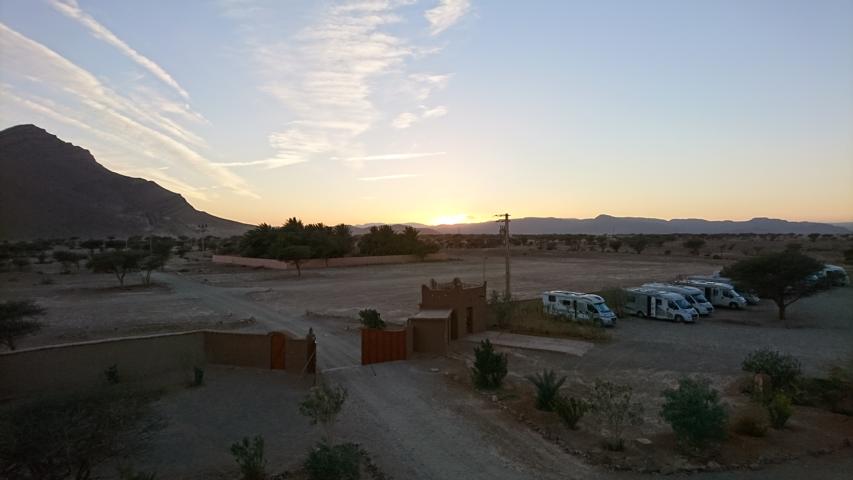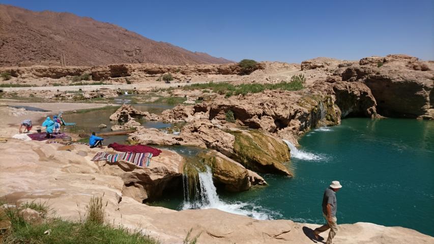 Die Sonne schien heiß auf unsere Köpfe und so suchten wir Abkühlung bei einer Mittagspause an den Wasserfällen von Tissint. Anschließend fuhren wir erfrischt weiter zur der kleinen Oase Foum Zguid. Nach drei Tagen wild Campen genossen wir nun die Annehmlichkeiten des Oasen Camping unter Palmen. |