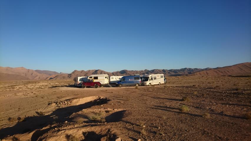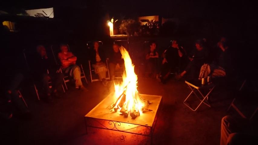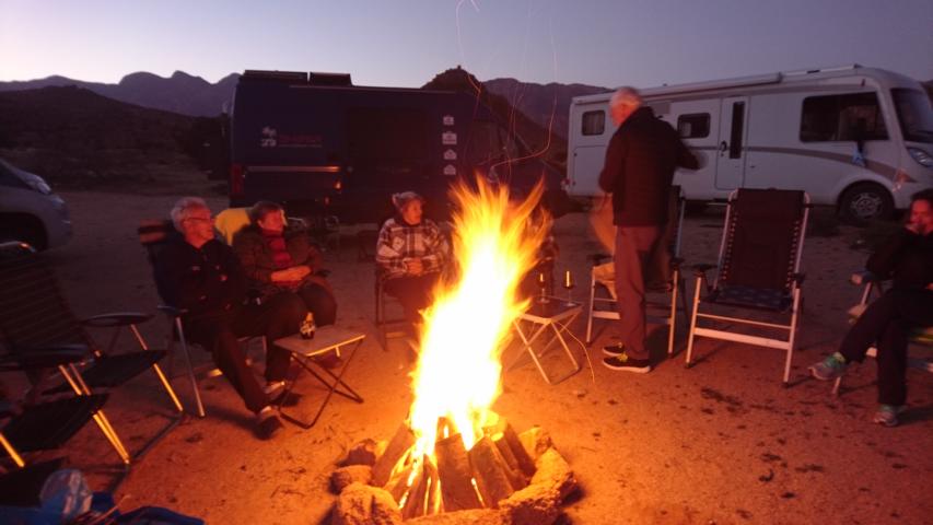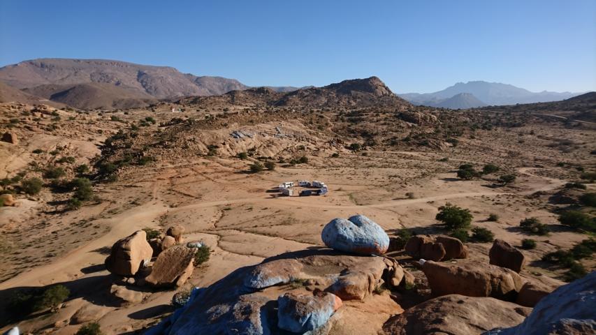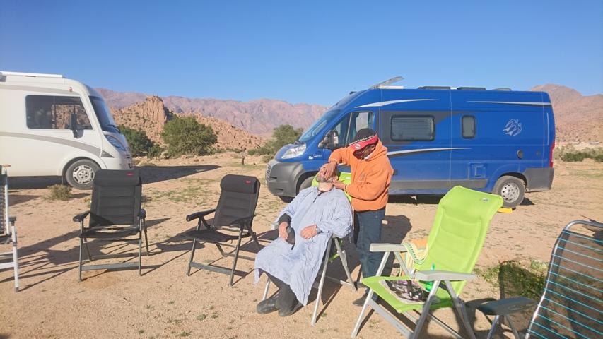 Die eindrucksvolle Bergwelt von Tafraoute war das Ziel. Unterwegs legten wir noch eine Mittagspause mit fantastischer Aussicht beim Hotel Kerdous ein. Am Nachmittag erreichten wir dann unser Lagerfeuer Camp und einige Entdecker hatten noch Zeit für eine Rasur oder ein neues Gemälde auf dem Auto. Am Abend genossen wir dann den Sternenhimmel am Lagerfeuer |