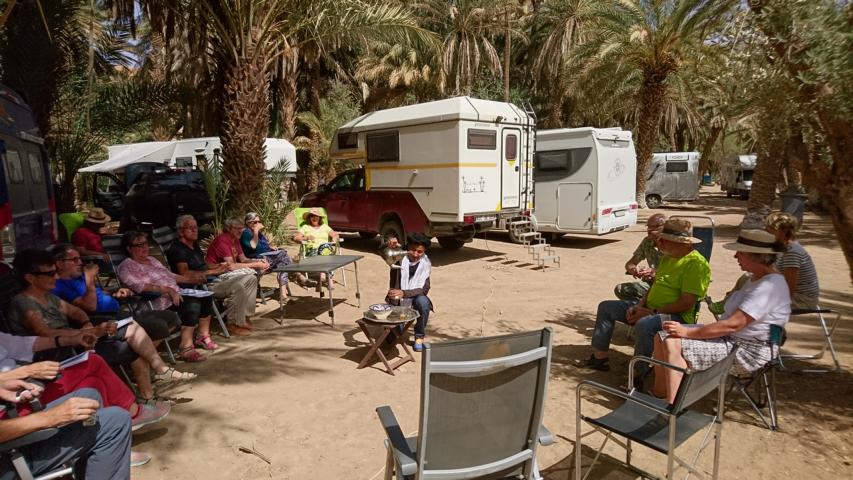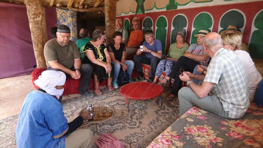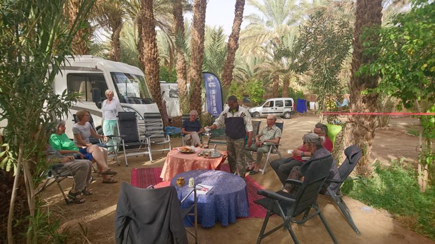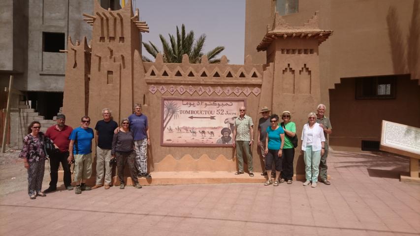 Dann fuhren wir weiter in die Karawanenstadt Zagora und machten ein Gruppenfoto vor dem bekannten Schild "52 Tage bis Tombouctou" Nach einer Mittagspause ließen wir uns mit Tee und Berberpizza auf dem Camping in der Oase verwöhnen |