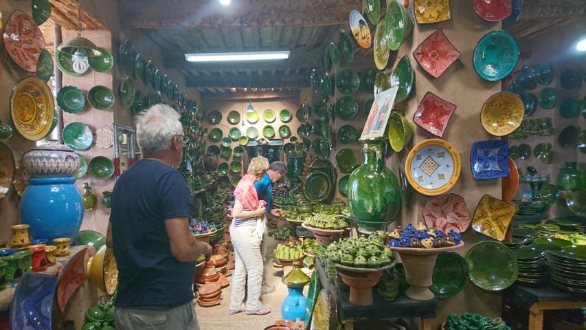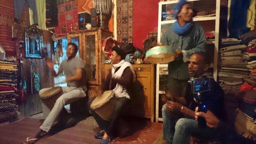 In Erfoud ließen wir uns noch das Geheimnis der Millionen alten Fossilen erklären und fuhren dann durch das schöne Ziz Tal zu den blauen Quellen von Meski Hier wurden wir von Mohamd mit Tee gegrüßt und anschließend zeigte er uns auf einem Spaziergang die interessante Umgebung Zum Abendprogramm gehörte dann noch Lammfleisch-Tajine und Trommel Musik im Teppichladen |