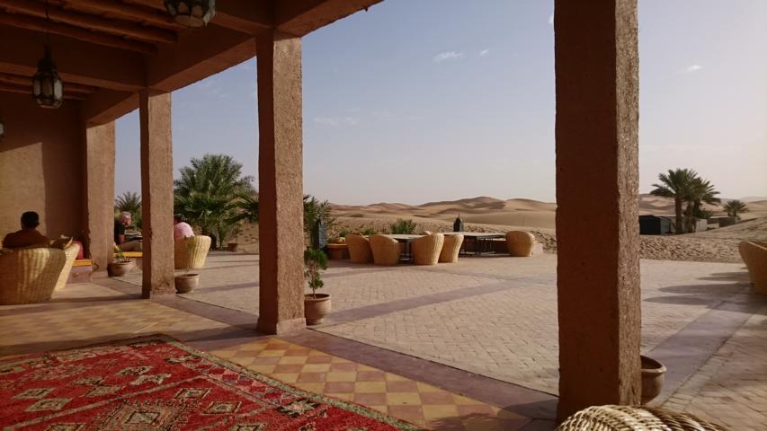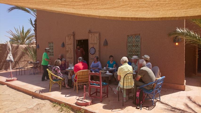 Unterwegs machten wir noch einen Stop bei Ali im Cafe' Fatamorgana und genossen seinen selbst gebackenen Kuchen Schon gegen Mittag erreichten wir dann das Ende der Teerstraße in Mhamid und fuhren auf den Camping. Dort besprachen wir dann noch die Details für die Jeeptour in die Wüste für den nächsten Tag