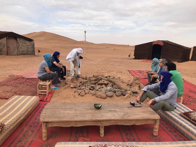 Danach ging es weiter wieder in die Wüste. Bei Salim, dem Wächter der Oasenwasserleitung legten wir noch eine Teepause ein, bevor es weiter ging über Rissani zu den hohen Sanddünen der Erg Chebbi. Hier feierten wir das Osterfest mit einem Feuer an den Sanddünen |