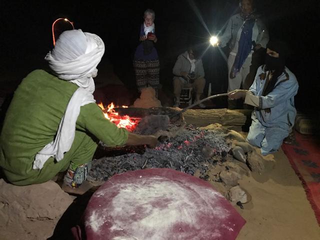 Mit den Jeeps ging es auf holprigen und sandigen Pisten zu den Nomaden und den hohen Dünen der Sandwüste. Am Abend gab es dann Hähnchen-Tajine und im Wüstensand gebackenen Brot im Camp |