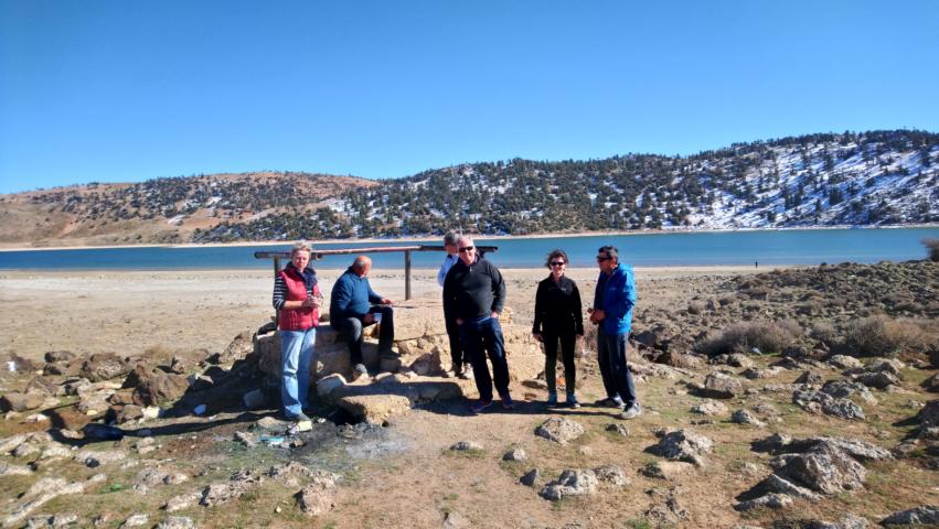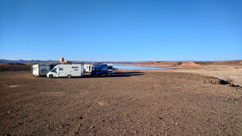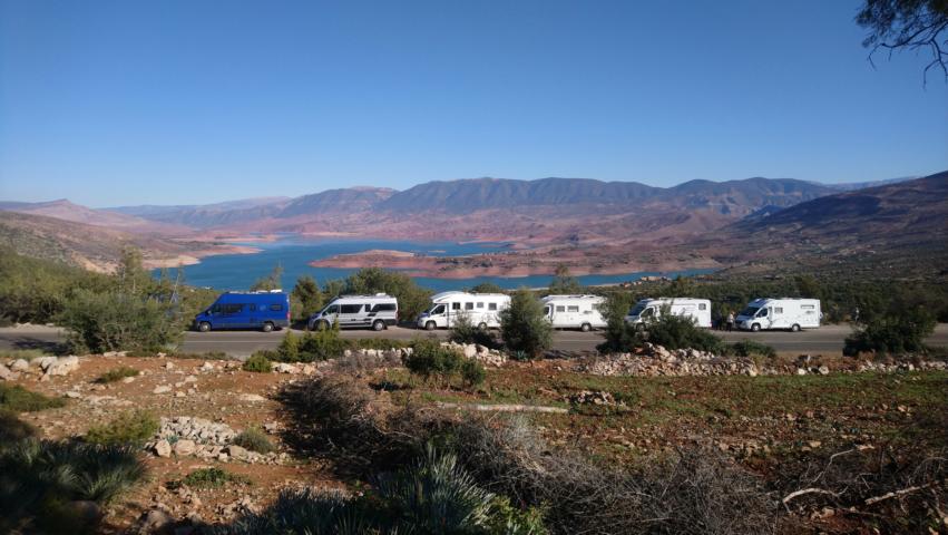 Am Stausee von Ifrane legten wir eine kurze Kaffeepause ein und fuhren dann hoch in den Anti Atlas zum Hotel Kerdous Nach der Mittagspause an diesem schönen Hotel mit Aussicht fuhren wir in die fantastische Bergwelt von Tafraoute und bauten uns am Stadtrand eine Wagenburg Abends saßen wir dann zur gemütlichen Runde am Lagerfeuer |