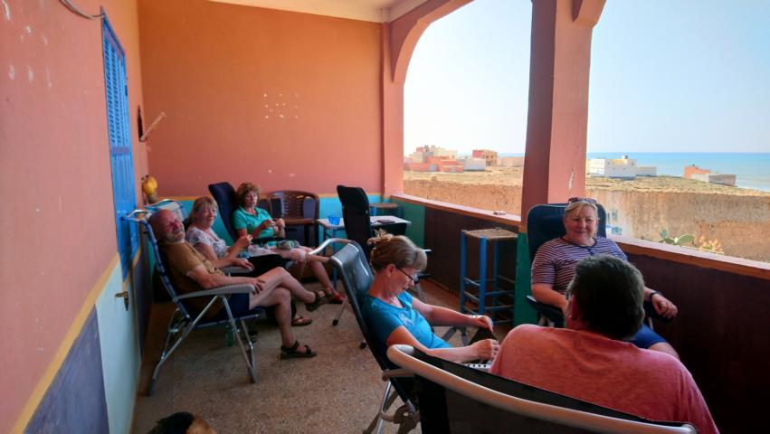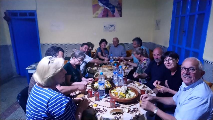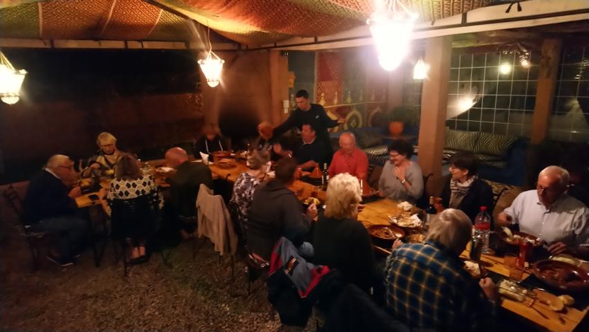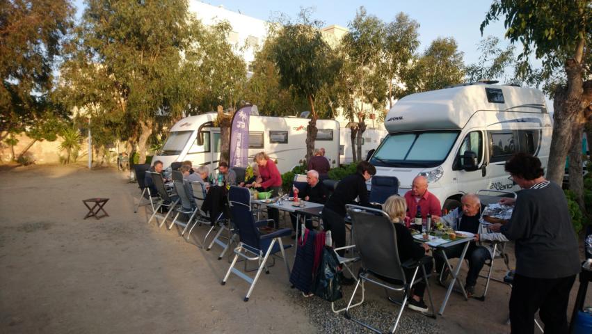 Die Fähre fuhr fast pünktlich und auch die Zollformalitäten in Tanger Med waren schnell erledigt und so kamen wir schon gegen Mittag in Martil an. Nach einem kleinen Einkaufsbummel durch Marjane fuhren wir weiter zu unserem Camping. Dort begrüßten wir dann noch die zwei fehlenden Gäste, die ein paar Tage vorher mit der Fähre aus Genua nach Marokko kamen. Am Abend gab es dann die Marokko Besprechung und zum Abschluss noch eine leckere Tajine |
