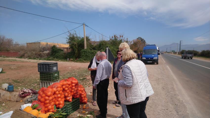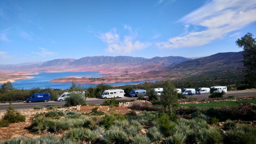 An Casablanca vorbei führte uns die Straße zum Mittleren Atlas . Noch bevor wir die Berge erreichten, versorgten wir uns noch an der Straße mit frischen Orangen und genossen dann zur Mittagspause die fantastische Bergwelt. Am Stausee Bin el Ouidane fuhren wir dann weiter zu unserem Camping in Ouzoud. Dort erwartete man uns schon mit dem vorbestelltem Abendessen |