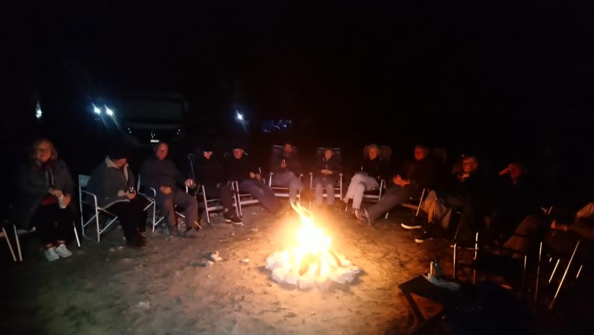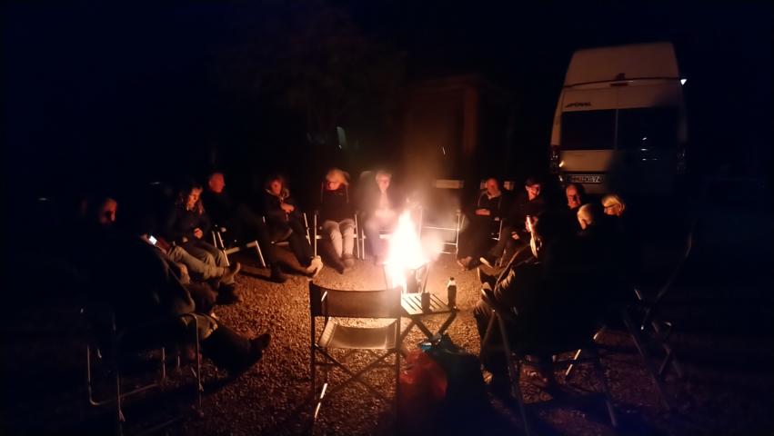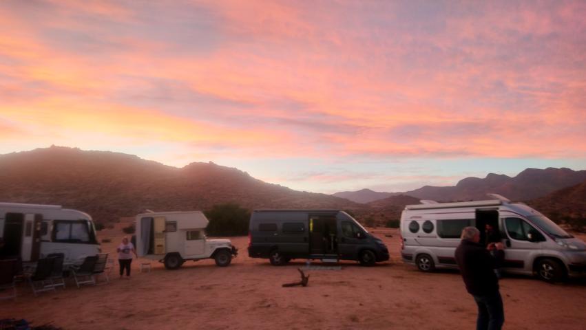Auf dem Stellplatz von Tafraoute bauten wir die erste Wagenburg und saßen am Abend vor dem Lagerfeuer |