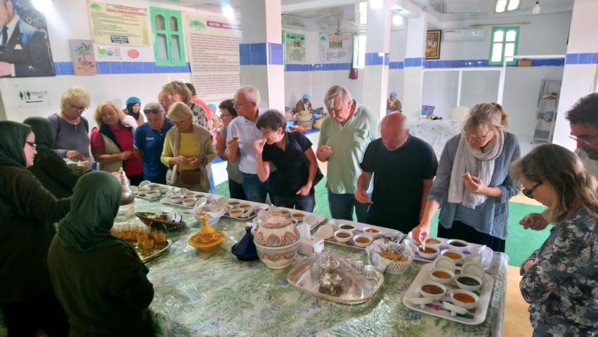 Dort besuchten wir eine Fossilienschleiferei und fuhren anschließend weiter durch das schöne ZIZ Tal zu den blauen Quellen von Meski Am Abend gab es dann noch ein leckeres Essen mit Musik und Tanz in einem Teppichladen auf dem Stellplatz |
