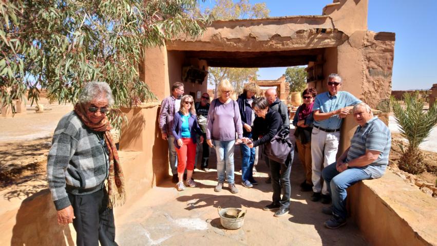 Weiter ging die Fahrt Richtung Wüste und unterwegs machten wir noch Halt bei dem Wassermuseum von Said und später noch eine Teepause bei den Oasen Wasserleitungen. Am Abend sahen wir dann am Horizont die orangen Sanddünen der Erg Chebbi im Abendlicht schimmern