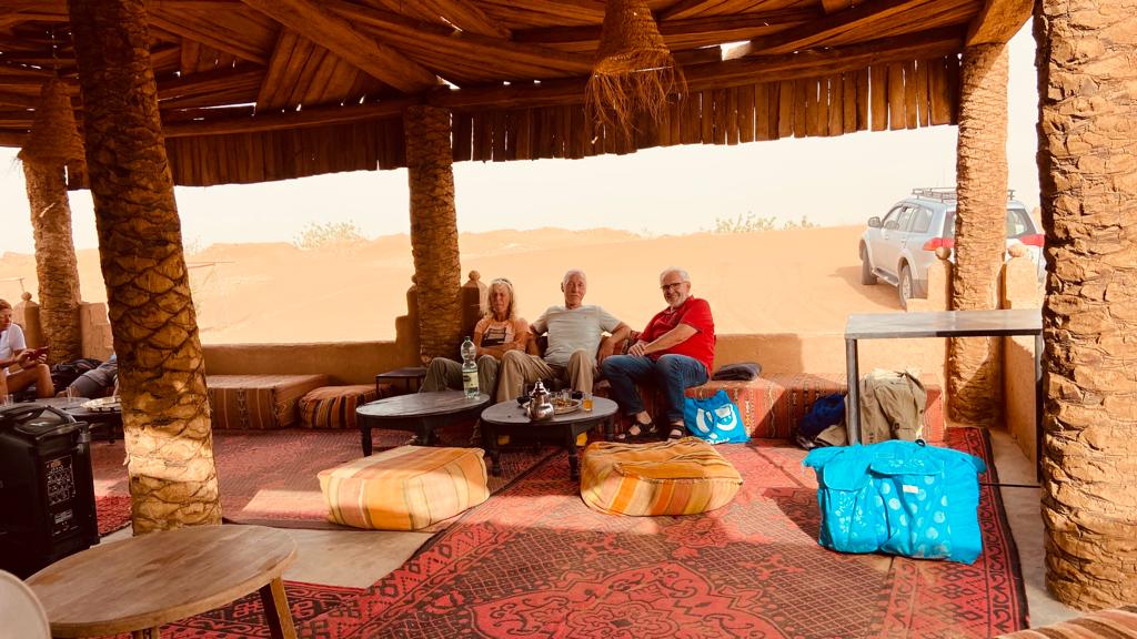 Dies ist auch unser südlichster Punkt der Reise. Hier füllten wir noch einmal unsere Vorräte auf , tankten die Fahrzeuge und fuhren dann auf menschenleeren kleinen Straßen zu unserem Wüstencamp nach Icht. Unterwegs machten wir noch Halt in der Oase Amtoudi mit der beindruckenden Speicherburg oberhalb der Oase Im Wüstencamp Borj Biramane waren wir noch beeindruckt von dem schönen Sonnenuntergang