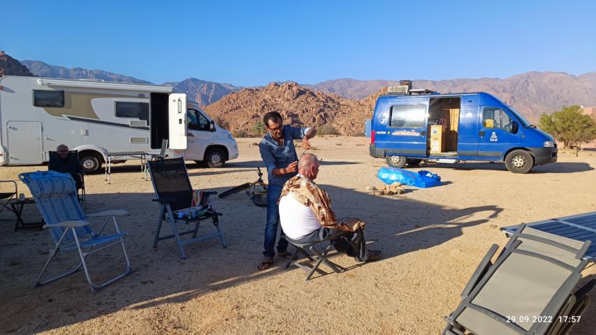 Auf kleinen schwindelerregenden Pässen fuhren wir hoch in den Anti Atlas und weiter durch das sehr enge und palmenumsäumte Ait Mansour Tal In Tafraoute angekommen bauten wir unsere erste Lagerfeuer Wagenburg Schnell hatten sich der Besuch der neuen Gäste im Dorf herumgesprochen und alsbald wurden uns etliche Dienstleistungen, wie Pizza Bringdienst, Autoreparatur und auch einen Friseur Service am Platz angeboten Zum Abend gab es dann unser erstes Lagerfeuer im Camp